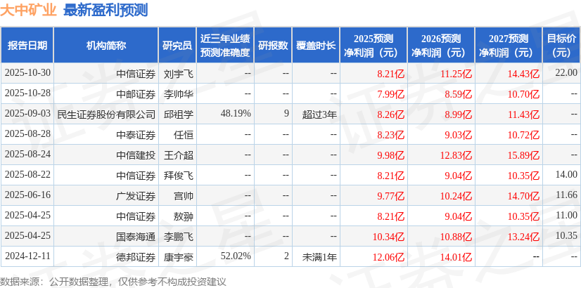 大中矿业2025年三季报显示,前三季度公司主要经营收入30.25亿元,同比上升1.6%;归母净利润5.94亿元,同比下降10.28%;扣非净利润5.92亿元,同比下降8.65%;其中2025年第三季度,公司单季度主营收入10.53亿元,同比上升4.89%;单季度归母净利润1.88亿元,同比下降5.54%;单季度扣非净利润1.92亿元,同比上升1.03%;负债率61.06%,投资收益728.34万元,财务费用1.82亿元,毛利率46.86%。